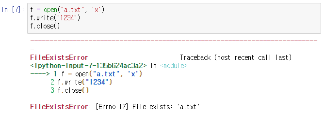 3. x (쓰기전용) : 새 파일 쓰기 모드로 파일을 연다. 주어진 이름의 파일이 존재하면 에러가 발생한다.