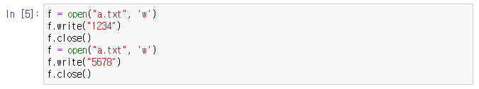 2. w (쓰기모드) : 파일을 쓰기 모드로 연다. 파일에 데이터를 쓰면 기존 파일의 내용은 사라진다. w 모드일 경우 주어진 파일이 존재하지 않으면 새로운 파일을 만든다.