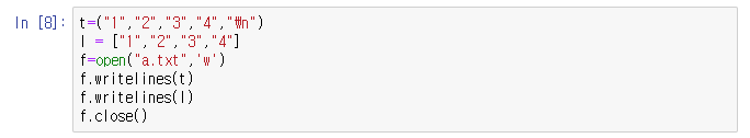리스트 또는 튜플 등의 내용을 입력하려면 writelines() 함수를 사용한다.