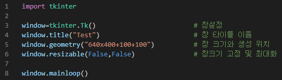 tkinter를 이용하여 창을 만들어 본다. 기본적인 tkinter를 앞으로 다루면서 익혀보는 보겠다.