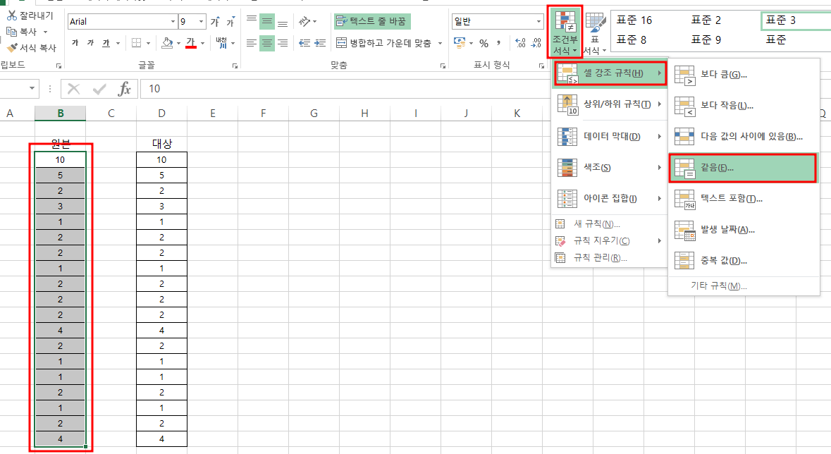 1. 비교할 원본을 선택한다. "홈->조건부 서식->셀 강조 규칙->같음"을 선택한다.