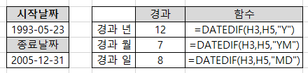 2. DATEDIF : 날짜의 경과를 구하는 함수로 근무 연수를 구하거나 만 나이를 구할 수 있는 함수