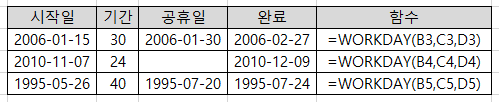 * 형식 : WORKDAY (Start_date, Days, Holidays)