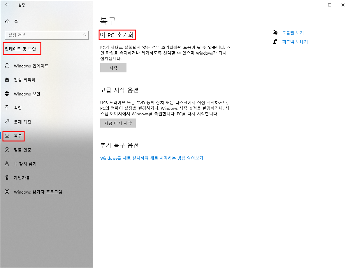 1. 제어판->업데이트 및 보안->복구에 '이 PC 초기화' 메뉴가 있다. 아니면 검색바에서 초기화 치면 나오기도 한다.