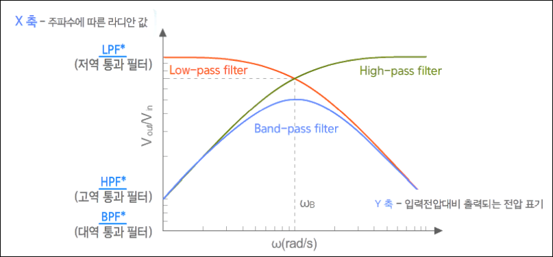이를 이용하여 RLC를 직렬 또는 병렬로 연결하여 필터를 구성할 수 있다. 이런 특성으로 크게 3가지의 필터가 구현이 되는데 저역통과필터(LPF:Low Pass Filter), 고역통과필터(HPF:High Pass Filter), 대역통과필터(BPF:Band Pass Filter)로 나뉜다.