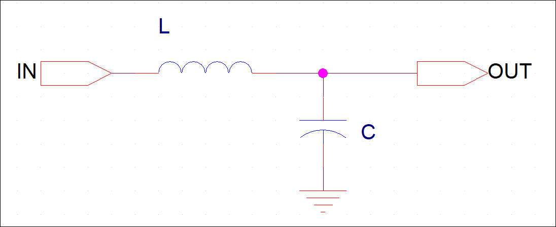 아래는 대표적인 LPF 필터로 L은 저주파를 통과하고 고주파를 차단한다. C는 저주파를 차단하고 고주파를 통과하지만 GND와 연결되어 있기 때문에 저주파는 차단되어 역할을 하지 않고 고주파일 경우 C를 통해 통과되어 GND로 빠지게 된다. 소자가 2개인 2단 LPF로 필터 효과를 높이기 위해서는 L과 C의 단수를 늘려가면 된다. 이 때의 L과 C 값은 앞서 공진 주파수로 정할 수 있다.