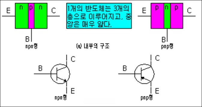 트랜지스터는 npn과 pnp 타입이 있다. 중앙의 얇은 반도체에 전류를 공급하면 층이 얇아져 E와 C에 전류가 흐르게 된다. 이 때 이 바이어스를 가하는게 정공이냐 전자냐에 따라 npn과 pnp의 스위칭 또는 증폭 특성이 된다.