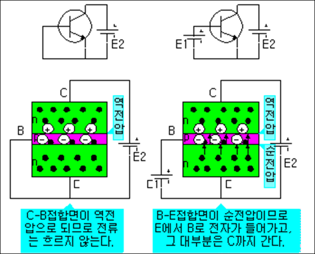 내부 전자의 움직임을 살펴본다. C-B간 역전압이 가해져 있는 것만으로는 전류가 흐르지 않는다. 단, C-B 접합면 가까이에는 전기장이 있다. B-E간에 순전압을 가하면, 이미터에서 베이스로 많은 전자가 흘러 들어가고, 그 전자의 대부분은 베이스가 대단히 얇으므로 바로 C-B접합면 가까이에 도달하며 C-B 접합면까지 도달한 전자는 그 접합면 가까이에 있는 전기장에 끌려 컬렉터 속으로 들어간다.