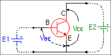 NPN TR의 경우 아래와 같이 Vbe에 순방향 전압이 걸리게 되면 Vce에 전류가 흐르게 된다. Vbe는 보통 0.3~0.8V 정도의 작은 전압이고 Vce는 수 V에서 수십 V까지의 전압이 걸린다.