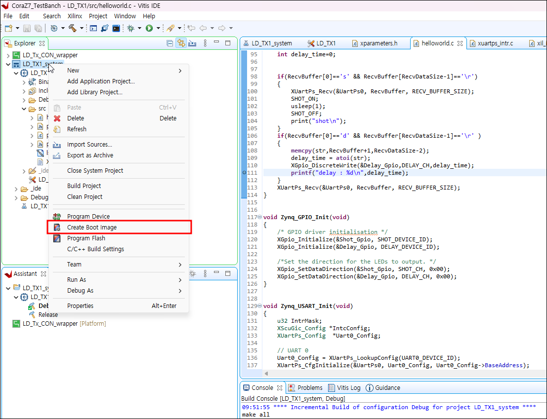 2. Boot Image를 생성한다. Vitis에서 프로젝트에서 오른쪽 버튼을 누르면 'Create Boot Image'를 선택하여 생성한다.