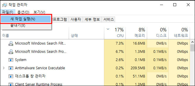 3. 앞서 말했던 작업표시줄에서 메뉴->파일->새 작업 실행(N)