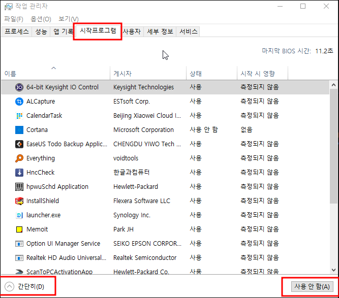 작업 관리자를 실행하면 시작프로그램 탭이 있다. 여기에서 사용 또는 사용을 중지할 수 있다.