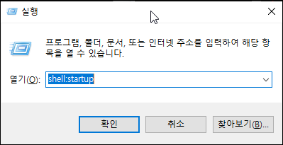 2. 윈도우키 + R 또는 윈도우버튼 오른쪽 마우스 클릭 후 실행으로 실행을 켜고 shell:startup 을 입력