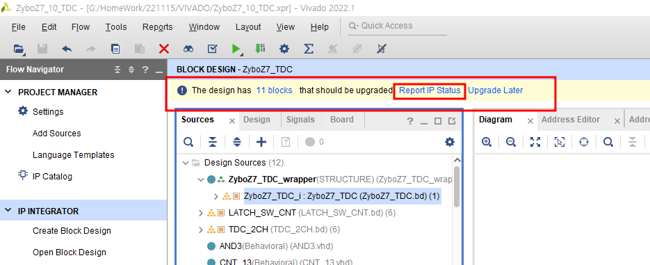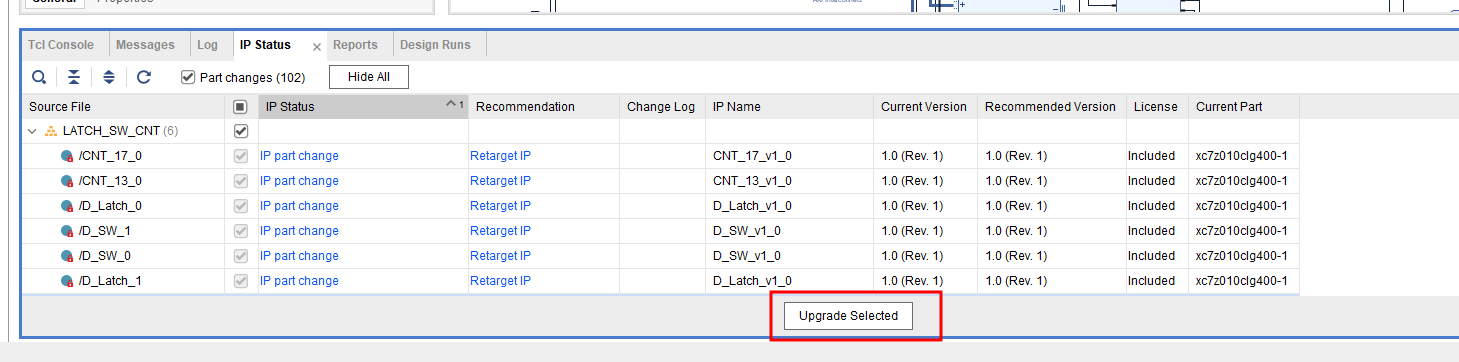 다 완료되면 딜레이 에러 창이 뜨는데 이건 뭐 OK 눌러서 패스.....(당연히 기존 프로젝트는 문제없는 것이어야 한다.) 창을 보면 노란색 바가 위와 아래에 생길 수가 있는데 일단 아래에 IP Status 쪽에 Rerun이 생겼고 Upgrade Select 버튼이 활성화 되어 있다면 한번더 Upgrade Select를 눌러 Upgrade를 하고 Rerun을 누른다. 이 후 Rerun과 Upgrade Select 버튼이 비활성화 되면 즉, Lock된 IP가 없다면 위의 Refresh Changed Modules를 클릭하여 마무리 한다.