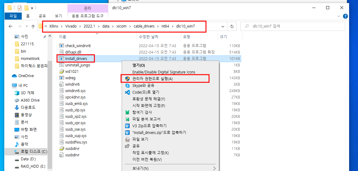 win10도 있는데 win7에 설치파일이 있다. 여기서 install_drivers.exe 파일을 관리자 권한으로 실행시키면 된다.