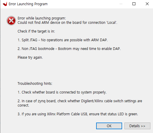 나 같은 경우는 맨 위의 Jungo가 나오지 않았고 나머지는 다 잡혔었다. 그러다보니 통신은 연결이 되는데 JTAG으로 다운을 하려고하면 JTAG 연결이 안되고 에러가 떴다. 에러는 Vivado에서는 하드웨어가 잡히지 않았고 Vitis에서는 다운로드시 연결 안될시 나오는 메시지가 출력되었다.
