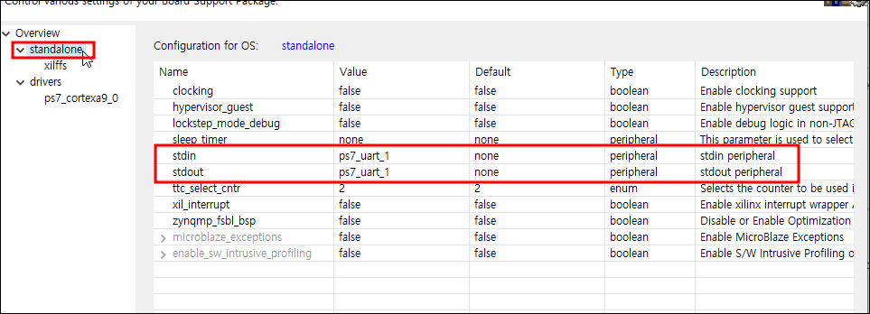 Board Support Package Settings, BSP Setting에서 standalone을 누르고 나오는 Configuration에서 stdin과 stdout을 설정할 수 있는데 여기서 입출력 표준을 설정하면 된다.