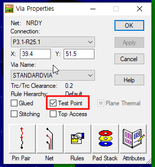 여튼 난 이렇게 테스트 포인트를 만들지 않고 회로도에서 부품으로 만들어서 배치하기 때문에 사용할 일이 없는데 라우팅 도중 뭘 잘못 누르면 저게 나와서 거슬릴 때가 있다. 이때는 아래와 같이 속성 창에서 Test Point를 끄면 된다.