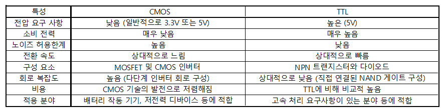 간단히 말하면 CMOS는 낮은 전력 소비와 높은 안정성을 가지며 TTL은 CMOS에 빠른 속도를 제공한다.