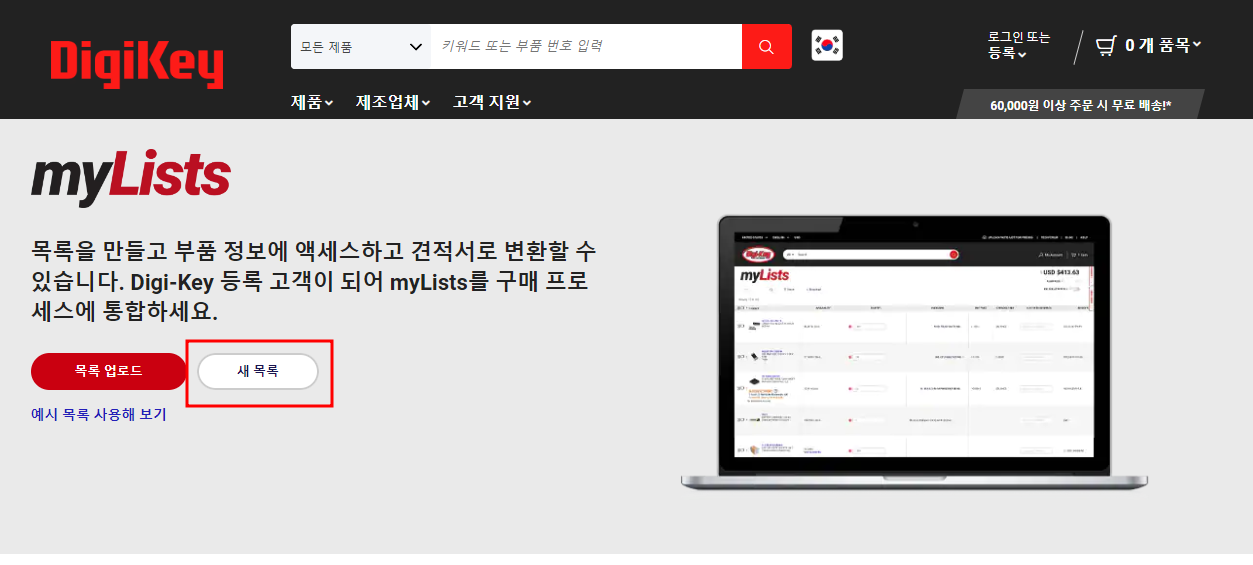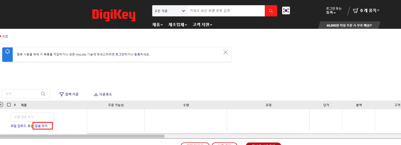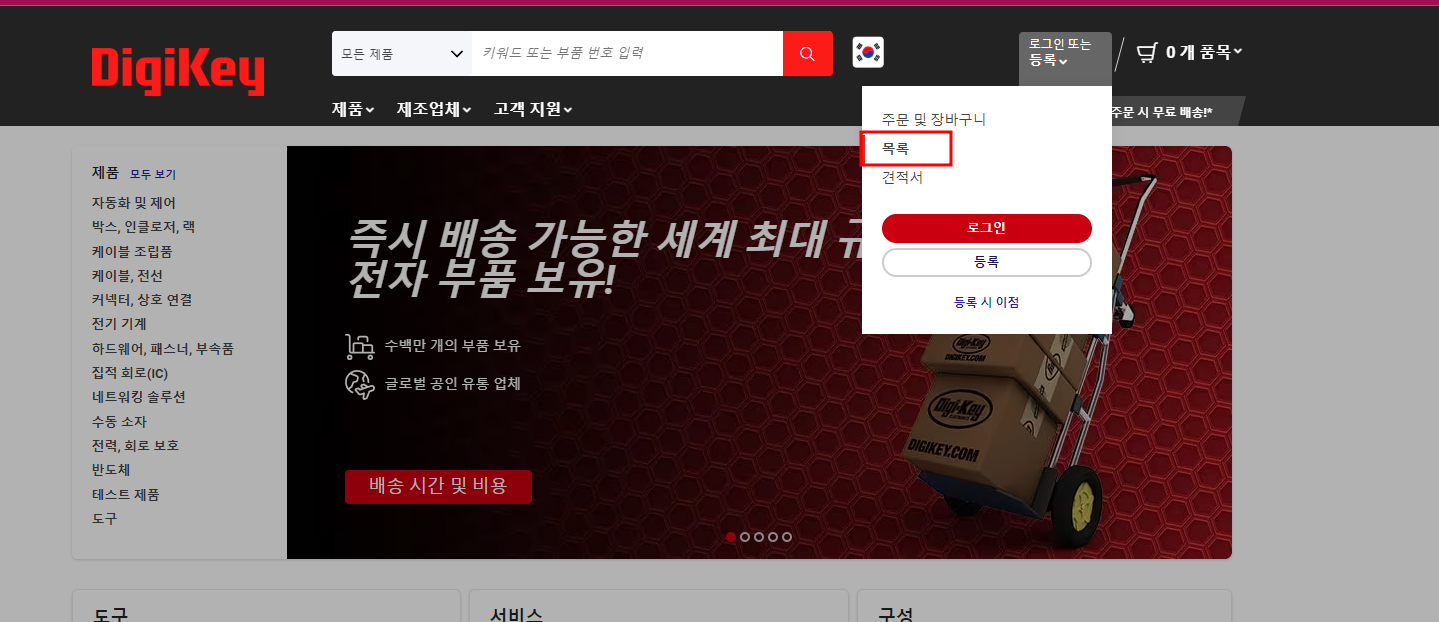 2. 디지키 로그인을 하고 목록을 선택한다. 여기서는 로그인을 하지 않아도 되는데 미리 등록해 놓으면 편하니 로그인해서 관리하는게 더 좋다고 본다. 포스팅은 로그인 안된 상태로 진행한다.