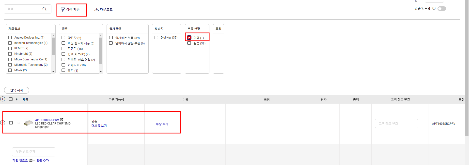 7. 나온 항목에서 검색기준을 클릭하면 부품 현황에 단종과 활성 부품의 갯수가 표시되고 이때 단종을 클릭하면 단종된 부품만 나타난다.