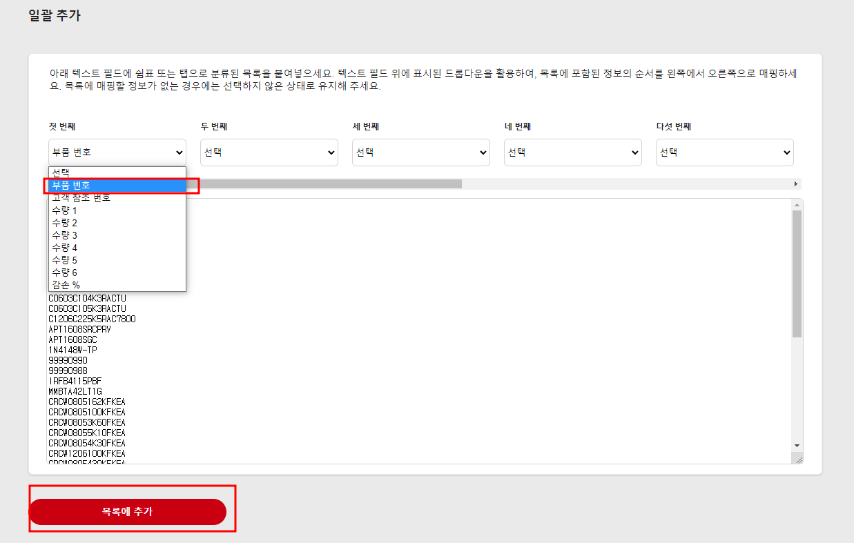6. 첫 번째 항목을 부품번호로 선택하면 아래 목록에 추가 버튼이 활성화 된다.