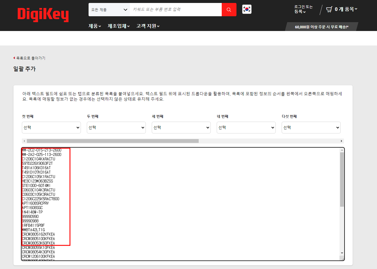 1. 부품 목록에 있는 부품 번호를 복사한다. 뭐 대부분 엑셀로 되어 있을테니 전체를 긁어서 복사한다.