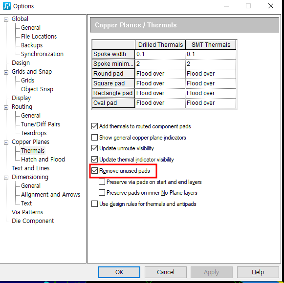 Remove unused pads는 해당 Via 또는 드릴이 내층의 plane net에 연결되지 않거나 패턴이 연결되지 않았을 때 사용하지 않는 pad로 인식하여 pad를 없애고 안티패드 형태로 만드는 기능이다.