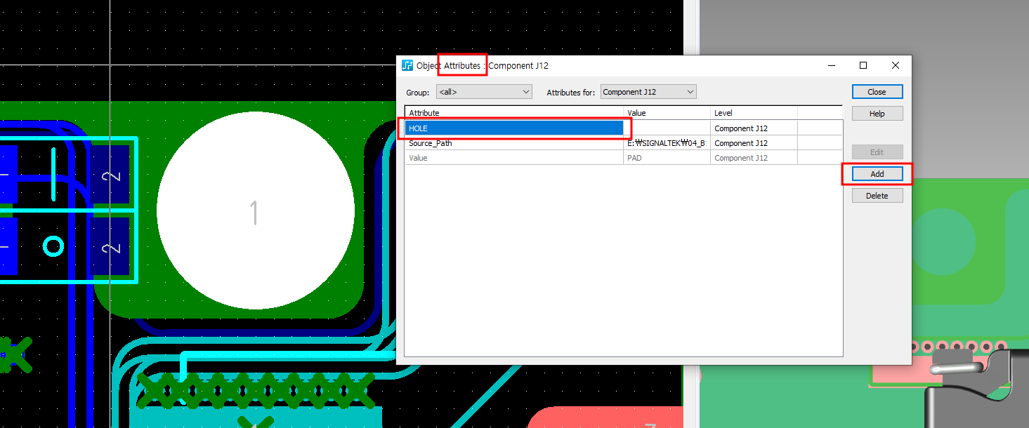 요는 홀이 생겨야하는 부품에 Attributes에 HOLE 특성을 추가하면 된다.