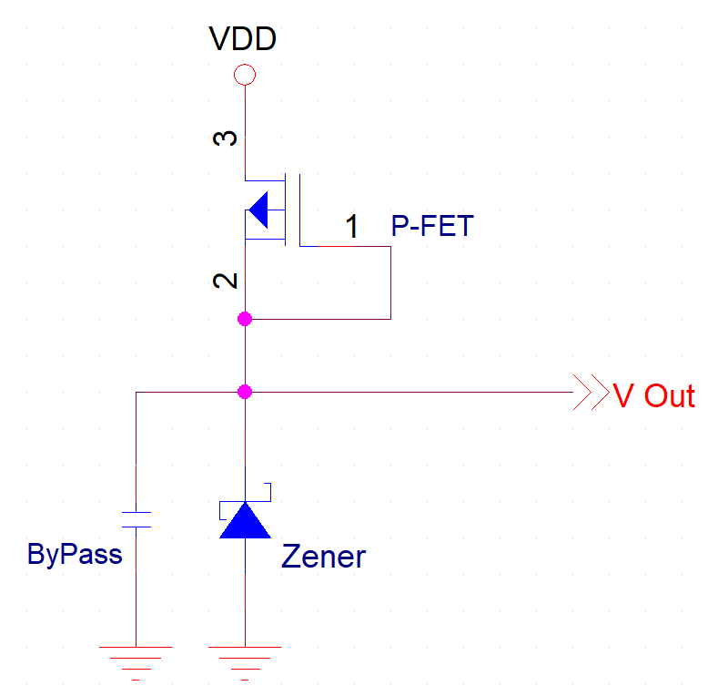 간단한 Ref 전원을 만드는 회로이다. 간단하게 Zener만으로도 정전압이 만들어지겠지만 FET의 정전류 특성을 추가하여 전원의 변동, 리플, 잡음 따위를 제거하여 안정된 기준 전원을 공급할 수 있다.