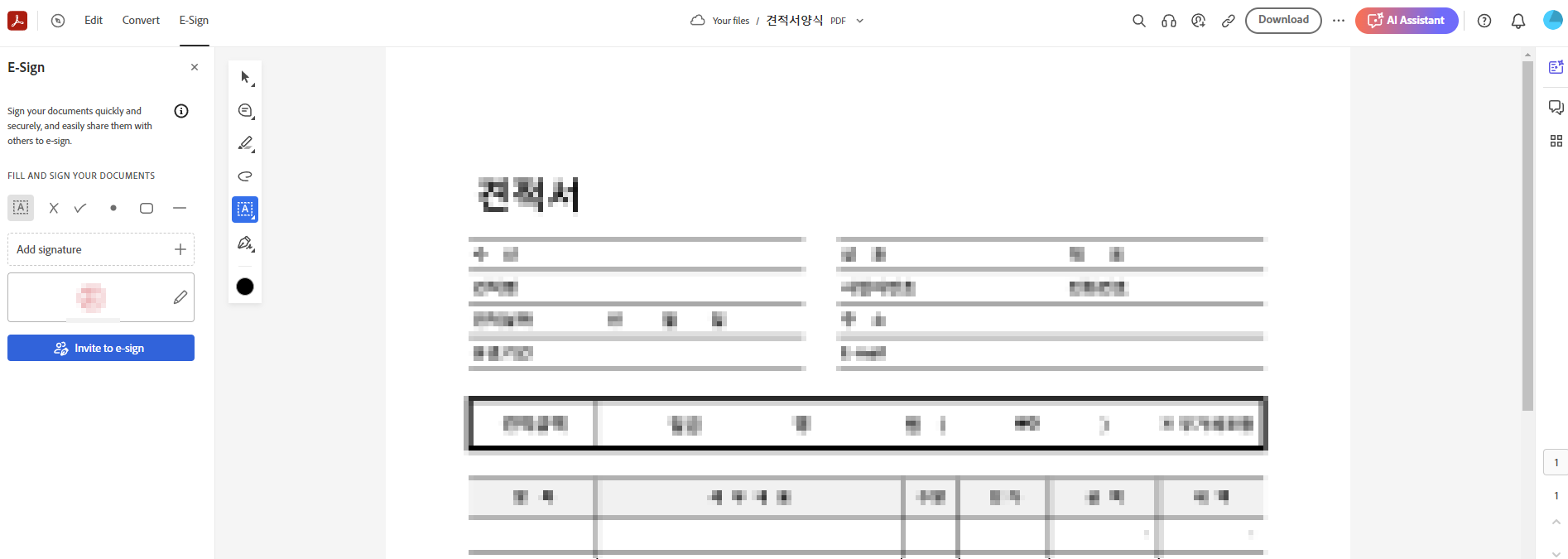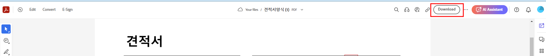 1. 서명을 할 PDF 파일을 올린다. 예로 인터넷에 있는 견적서 양식을 하나 받아왔다.