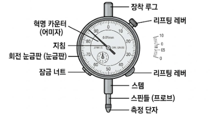 - 다이얼 게이지: 기어 기구를 통해 측정량의 변화를 지침의 회전량으로 변환하여 보여준다. 평면도나 흔들림 측정에 주로 쓰인다.