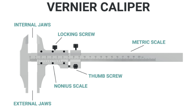 - 버니어 캘리퍼스: 어미자와 아들자의 눈금을 이용하여 외경, 내경, 깊이, 단차를 측정한다. 보통 0.05mm나 0.02mm까지 읽을 수 있다.