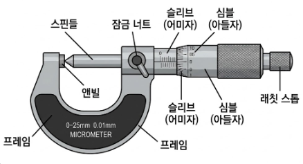 - 마이크로미터: 나사의 원리를 이용하며 버니어 캘리퍼스보다 정밀도가 높다. 0.01mm에서 0.001mm 단위까지 정밀 측정이 가능하다.