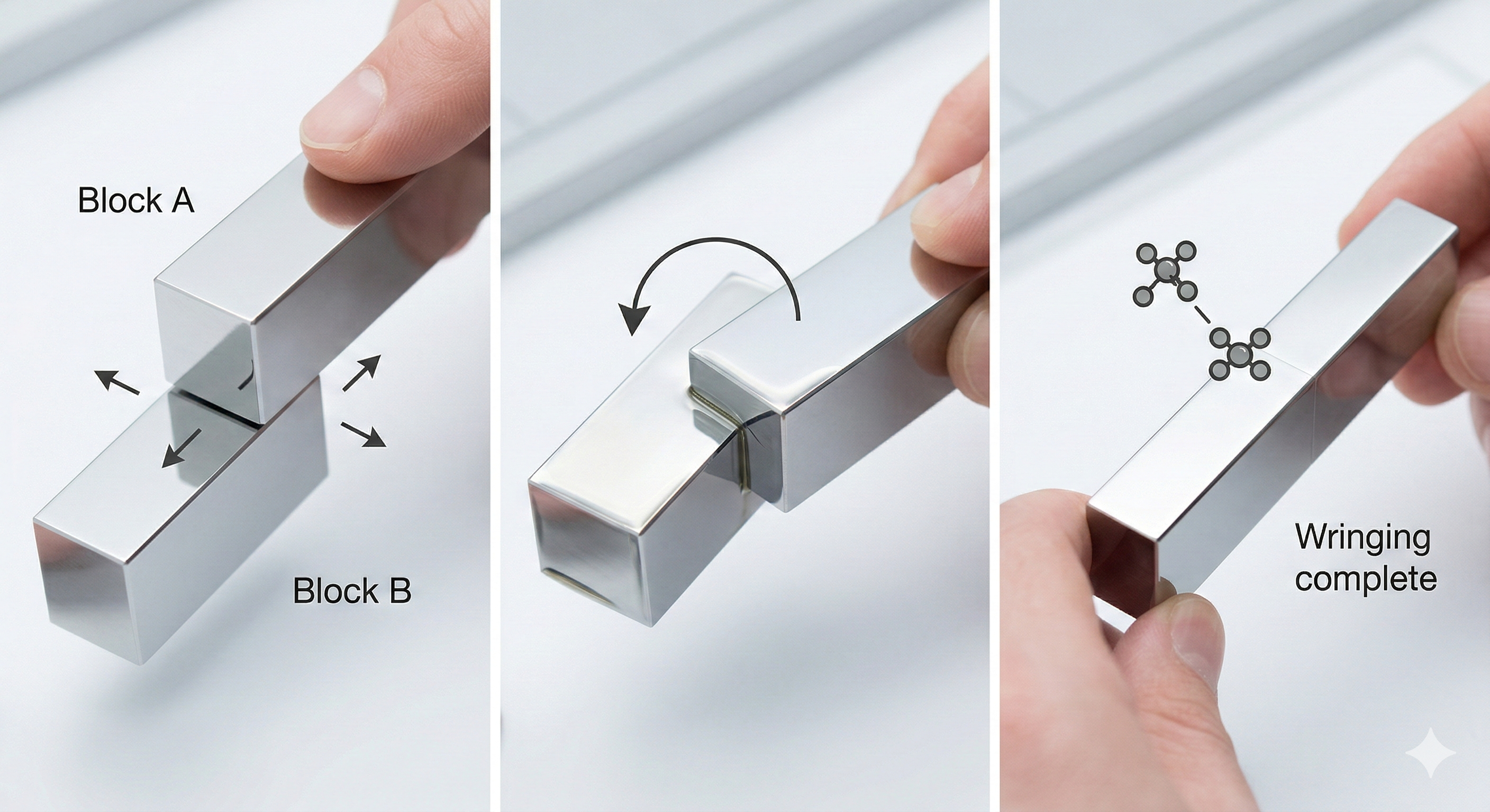 - 밀착: 두 블록의 표면을 깨끗이 닦고 손기름을 약간 바른 뒤, 십자 방향 등으로 비비듯 밀어 넣어 공기를 빼며 단단하게 붙인다.
